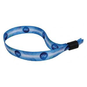 A full color sublimated wrist band for a one time use. Slide the plastic bead to tighten the wrist band, then cut off the excess. The bead can only tighten and will not loosen. A nice upgrade to the Tyvek bands that are often used.
