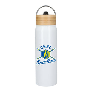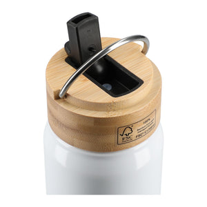 constructed from 100% post-consumer recycled Aluminum material. It features a screw-on, spill-resistant FSC certified bamboo lid with the flip top integrated straw with wide opening for easy cleaning & refill included durable stainless steel hand loop. The exterior has a trendy glossy finish. This 26oz sports bottle is hand wash only, fits most standard cup holders.