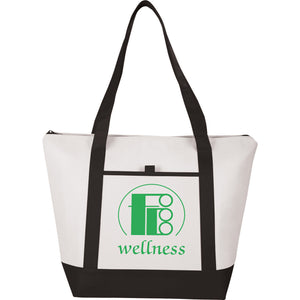 Insulated with heat-sealed water-resistant lining. Zippered main compartment with double 24" handles. Open front pocket with pen loop