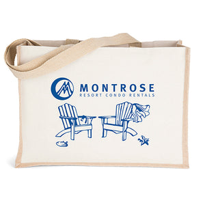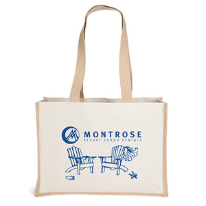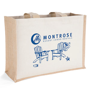 This reusable bag features durable 10-oz. cotton front and back panels that offer a generous imprint area, paired with natural-colored jute gussets and bottom. The interior gussets are laminated..
