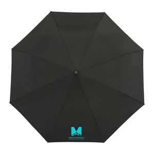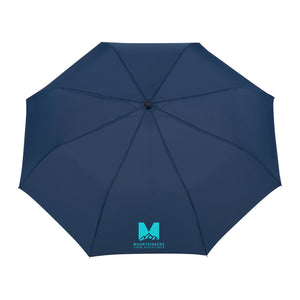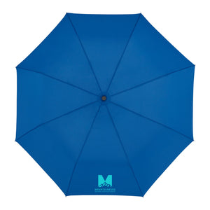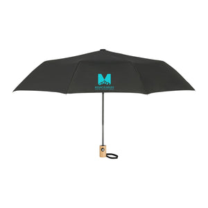 Auto Open Umbrella is the perfect size. This umbrella is made metal and fiberglass and features and FSC wood handle with ABS button. It's easy to store with it's matching RPET sleeve that comes in an FSC pouch! Wind rated up to 25mph.