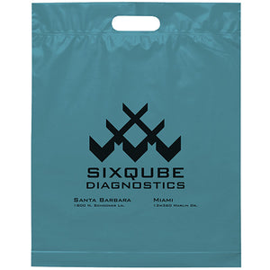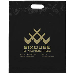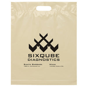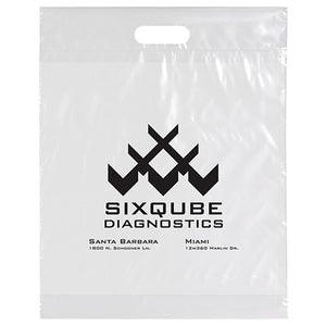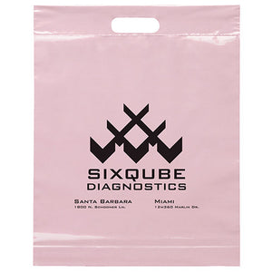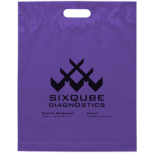 Plastic bags with fold-over reinforced die cut handles and bottom gusset on select sizes