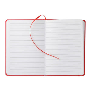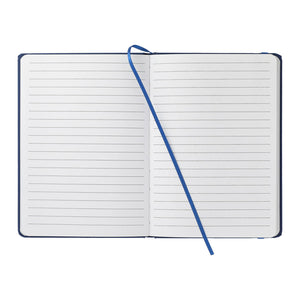 Elastic closure notebook with matching color bookmark. 80 ruled page notebook