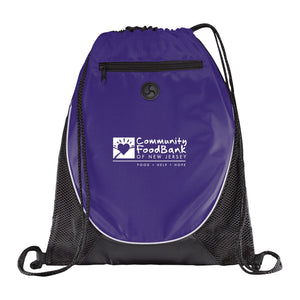 Drawstring backpack with rope closure. Zippered front pocket with earbud port