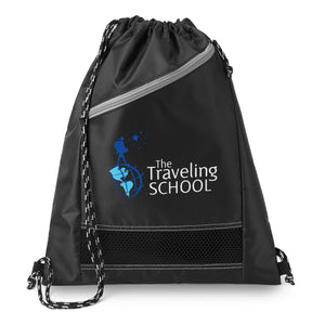 Cinch closure main compartment. Front diagonal zippered pocket. Ventilating mesh accent.